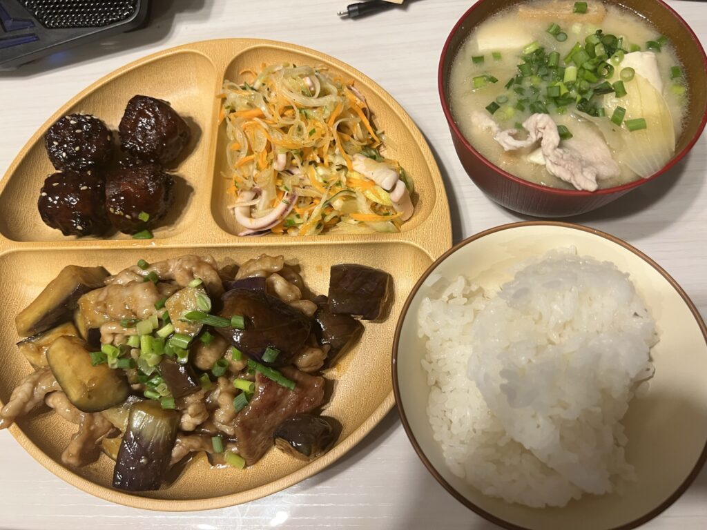 本日は、トロトロの茄子に旨味たっぷりの豚肉が絡む**「茄子と豚肉の甘辛炒め」をメインに、お箸が止まらない「肉団子の甘酢あん」、そしてイカの旨味が凝縮された「いかと春雨の中華風サラダ」と、具だくさんの「豚汁」**を組み合わせた、満足感たっぷりの和中華折衷の献立です。