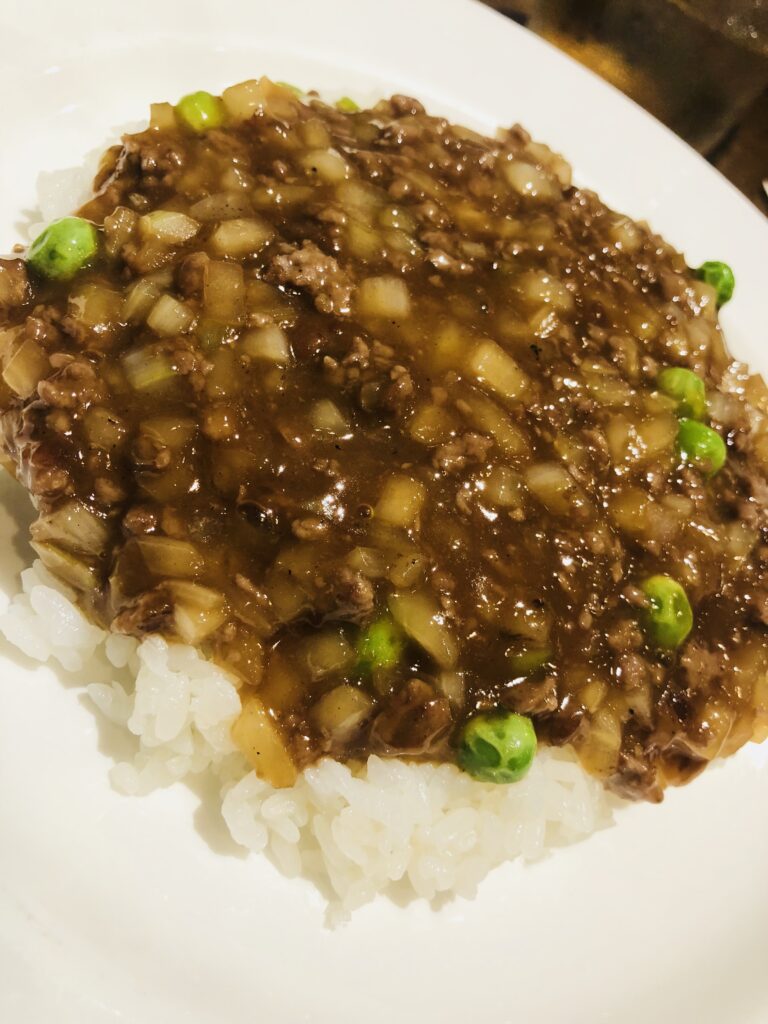 本日は、材料もシンプルでパッと作れる**「ひき肉の甘辛あんかけ丼」**がメインです。玉ねぎの甘みとひき肉の旨味が溶け出したあんがご飯に絡み、大人から子供まで喜ぶ一皿。彩りに添えたグリーンピースが、食卓をパッと明るくしてくれます。
