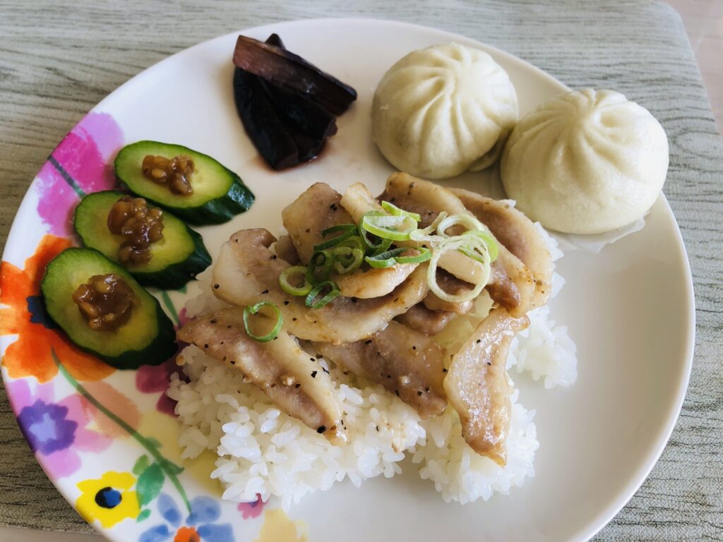 本日は、ジューシーな脂がたまらない**「トントロの塩ダレ焼き」をご飯にたっぷり乗せた丼をメインに、お家で楽しむ「小籠包」、そして箸休めに最適な「自家製ぬか漬けともろきゅう」**を合わせた、大満足のワンプレート献立です。