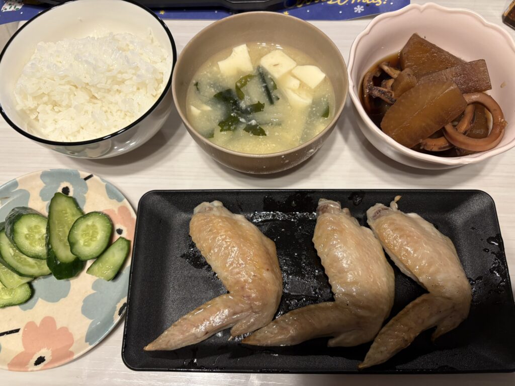 本日は、塩水に漬け込んでから焼き上げることでジューシーに仕上げた**「とり手羽先の海水焼き」がメインです。副菜には、いかの旨味を大根がたっぷり吸った「いか大根」を合わせ、自家製の「きゅうりのぬか漬け」**で彩りと爽やかさを添えました。